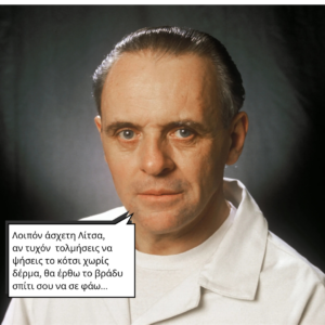 Όση ώρα έπινα τους ατέρμονους καφέδες, άκουγα τη Μαίρη και τη Λίτσα που καθάριζαν τη σάλα του πρωινού στο ταπεινό χοτέλ. Η Μαίρη εξεμάνη γιατί το μαρούλι έκανε 1.20 και το μπρόκολο 4 ευρώ ενώ η Λίτσα περιεγράφε πόσο τέλειο ήταν το ζυγούρι που έφερε ο άντρας της από κάποιο τοπικό κρεατοψηστήριο. Μετά η Μαίρη, η οποία είχε μάλλον τις μαύρες της περιέγραψε πως άφησε στο σπίτι στους “κυρίους” πατάτες κι αυγά γιατί δε μπορεί να μαγειρεύει άλλο και τέλος πάντων “μια χαρά είναι οι πατατες και τ’ αυγά”. Δεν διευκρίνησε ποιοί είναι οι “κύριοι” αλλά υποθετω πως εννοούσε σύζυγο και τέκνα. Η Λίτσα άκουγε σιωπηλά και σε κάποιο κενό της Μαίρης είπε πως, “αύριο σκέφτομαι να φτιάξω κότσι“. Η Μαιρη την ρώτησε αν το ψήνει με το δέρμα ή όχι, εγώ υπέθεσα πως εννούσε τη πέτσα και μετά ακολούθησε μια συζήτηση μεταξύ τους για το πως ψήνεται πιο καλά το κότσι, με το δέρμα ή όχι. Το γεγονός ότι χρησιμοποιούσαν την λέξη “δέρμα” για κάτι που θα μαγειρέψουν μ΄έβαλε σε σκέψεις για πιθανή συγγένεια της Μαίρης και τη Λίτσας με τον Δόκτωρ Χάνιμπαλ Λέκτερ. Στο τέλος της συζήτησης συμφωνησαν πως το κότσι είναι τέλειο όπως και να το μαγειρέψεις και δεν υπάρχει κανένας λόγος να το τρώνε μόνο κάθε Χριστούγεννα. Μετά μίλησαν για την Μπέτυ που έκλεισε το κομμωτήριο λόγω σύνταξης και για την Ασπασία που ο αδελφός της, που δεν έχει παιδιά, της έταξε το μισό σπίτι.